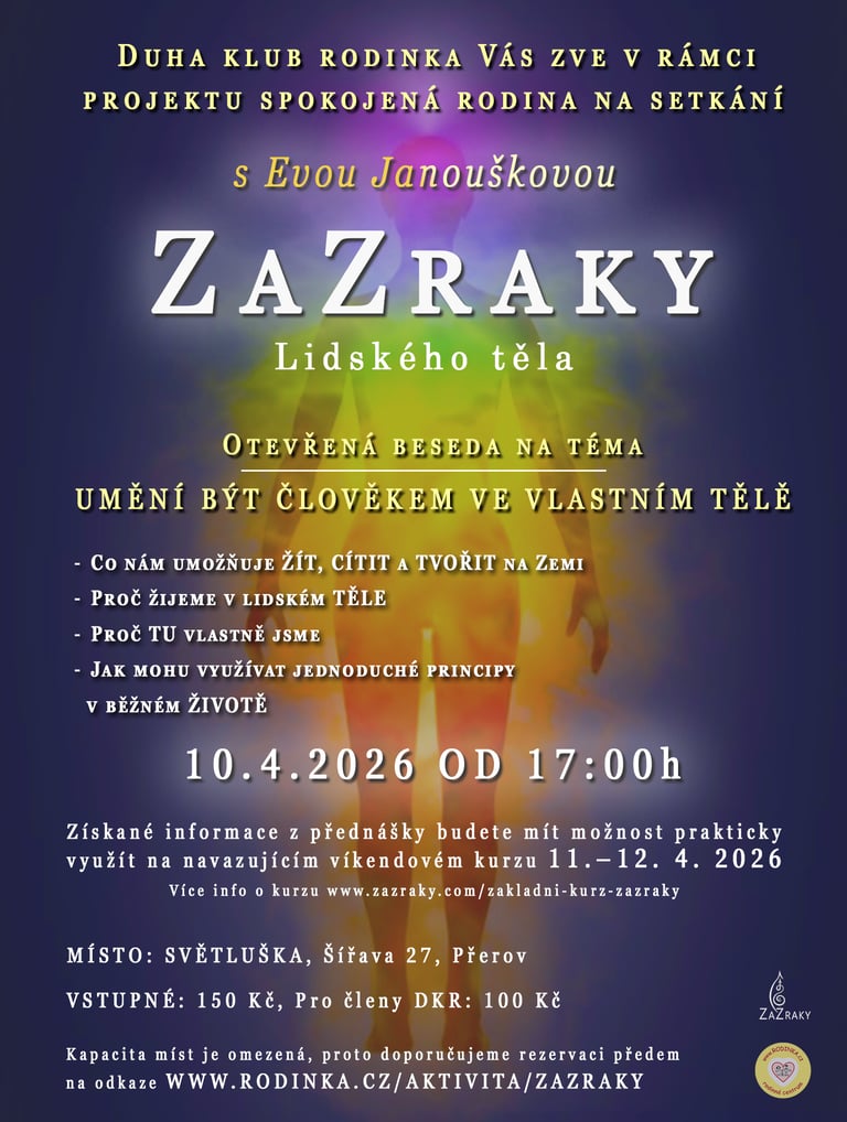 Získané informace z přednášky budete mít možnost prakticky využít na navazujícím dvoudenním Základním kurzu ZaZraky Lidského těla, který proběhne v sobotu a neděli